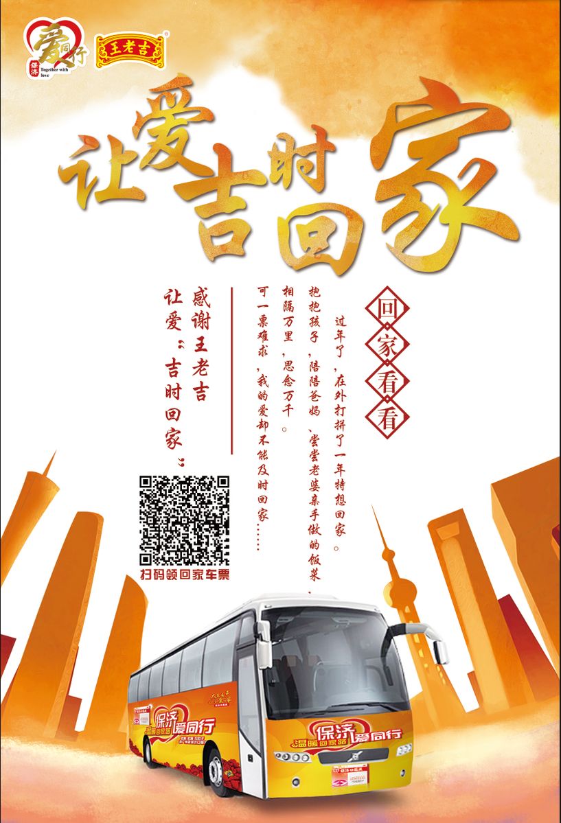 据了解,本次公益活动主办方广东省让爱回家公益促进会,协办方广东广播电视台、王老吉药业精心准备了从“回家”到“到家”每个环节的暖心公益活动,期盼用爱心温暖每一位游子的回家之路,包括免费爱心大巴、高速爱心礼包、药店爱心派赠等三大爱心项目,让爱吉时回家。
